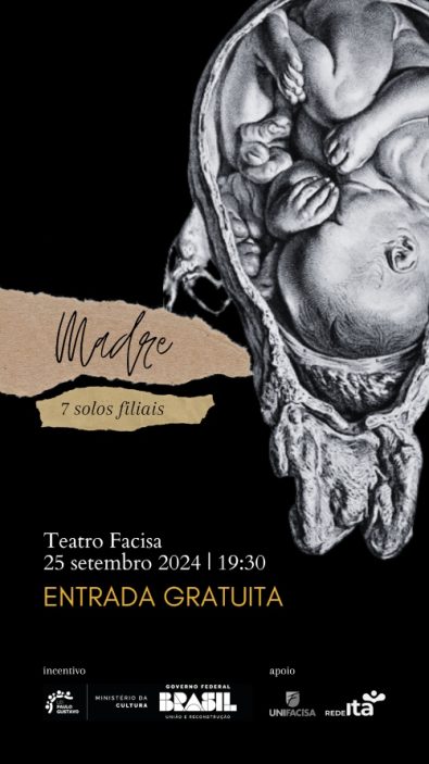 Como parte das ações da Semana Nacional da Responsabilidade Social, o Teatro Facisa será palco do espetáculo dramático “Madre: 7 solos filiais”, do renomado dramaturgo Saulo Queiroz. A apresentação será realizada na próxima quarta-feira, 25 de setembro, às 19h30, no Teatro Facisa, totalmente gratuito e aberto ao público em geral. Classificação indicativa: 16 anos.